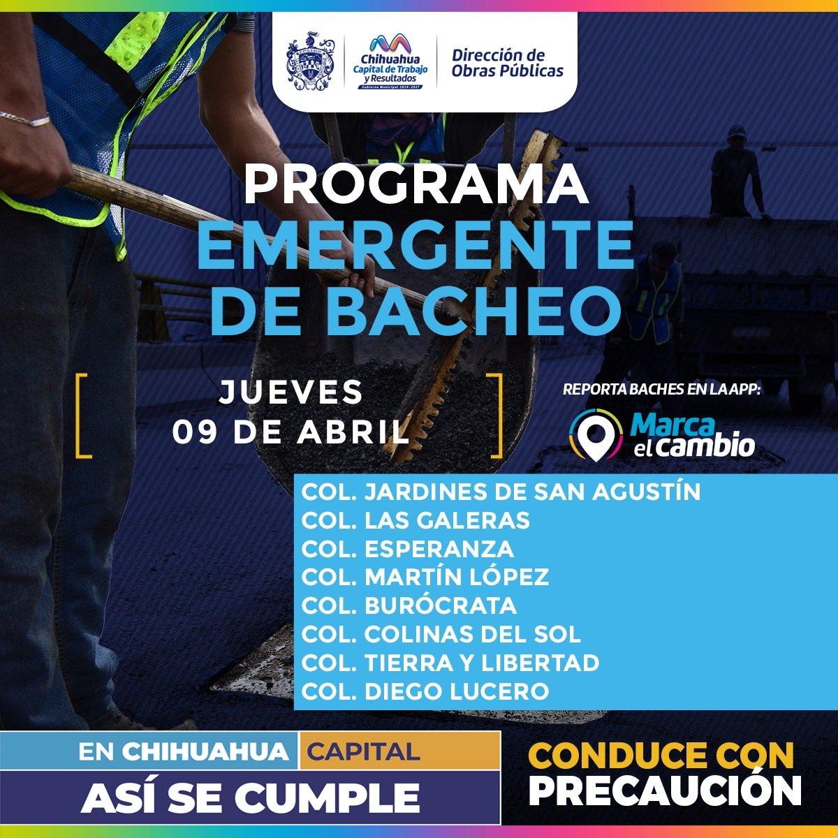 El Gobierno Municipal, a través de la Dirección de Obras Públicas, realizará trabajos de bacheo este jueves 9 de abril mediante el programa emergente en las calles de las colonias: Jardines de San Agustín, Las Galeras, Esperanza, Burócrata, Colinas del Sol, Tierra y Libertad y Diego Lucero.