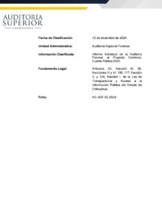 Un informe de auditoría forense realizado por la Auditoría Superior del Estado (ASE) de Chihuahua al Proyecto Centinela, correspondiente a la Cuenta Pública 2023, ha sido clasificado como reservado por la propia ASE, bajo el argumento de “cuestiones de seguridad”. El documento, con folio AC-EF-02-2024 y fechado el 12 de diciembre de 2024, investigó el sistema de vigilancia masiva, y su naturaleza forense determina la posible existencia de graves irregularidades, aunque su contenido permanece inaccesible para la ciudadanía.
