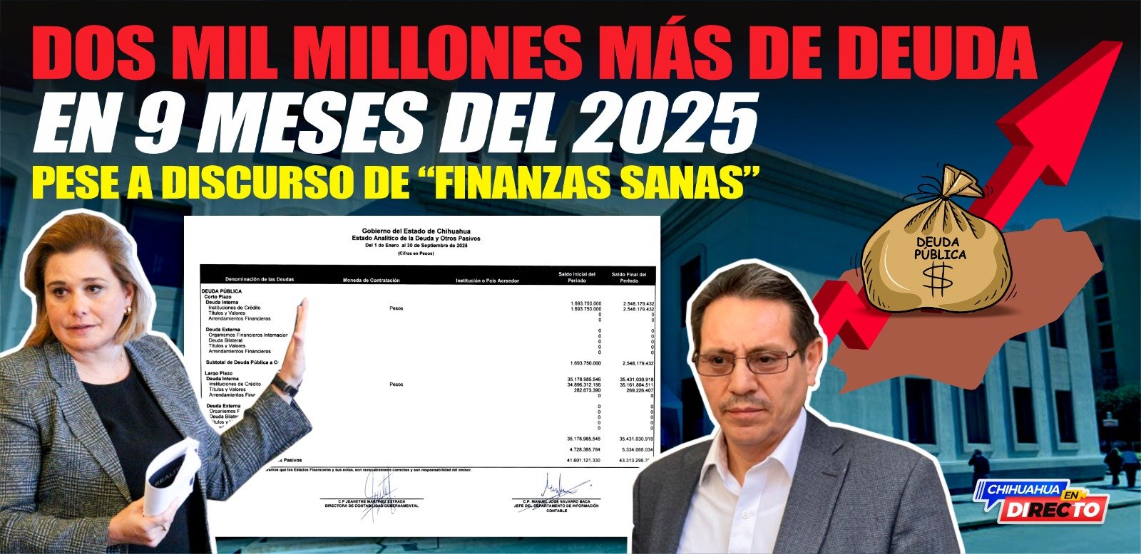 En apenas nueve meses, la deuda pública del Gobierno del Estado de Chihuahua aumentó en 2 mil millones de pesos, de acuerdo con el Estado Analítico de la Deuda y Otros Pasivos correspondiente al periodo del 1 de enero al 30 de septiembre de 2025.