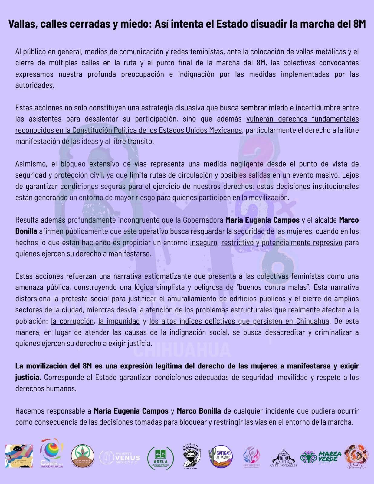 Las organizaciones también cuestionaron que tanto la gobernadora Maru Campos como el alcalde de Chihuahua, Marco Bonilla, hayan señalado que el operativo busca resguardar la seguridad de las mujeres, pues consideran que en los hechos genera un entorno “inseguro, restrictivo y potencialmente represivo” para quienes ejercen su derecho a manifestarse.