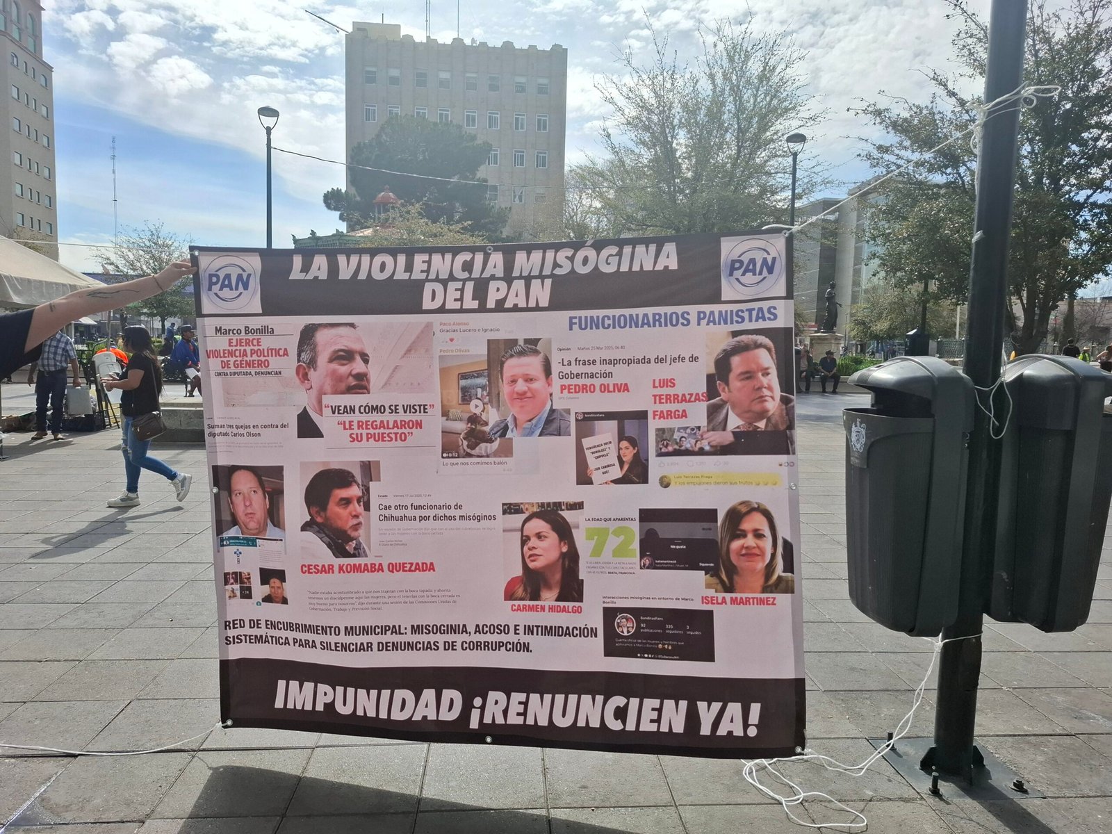 En el material gráfico aparecen nombres y fotografías de exfuncionarios y personajes vinculados al PAN, entre ellos Luis Terrazas, exfuncionario municipal que ya fue separado de la administración; así como el alcalde Marco Bonilla, Carlos Olson y César Komaba.