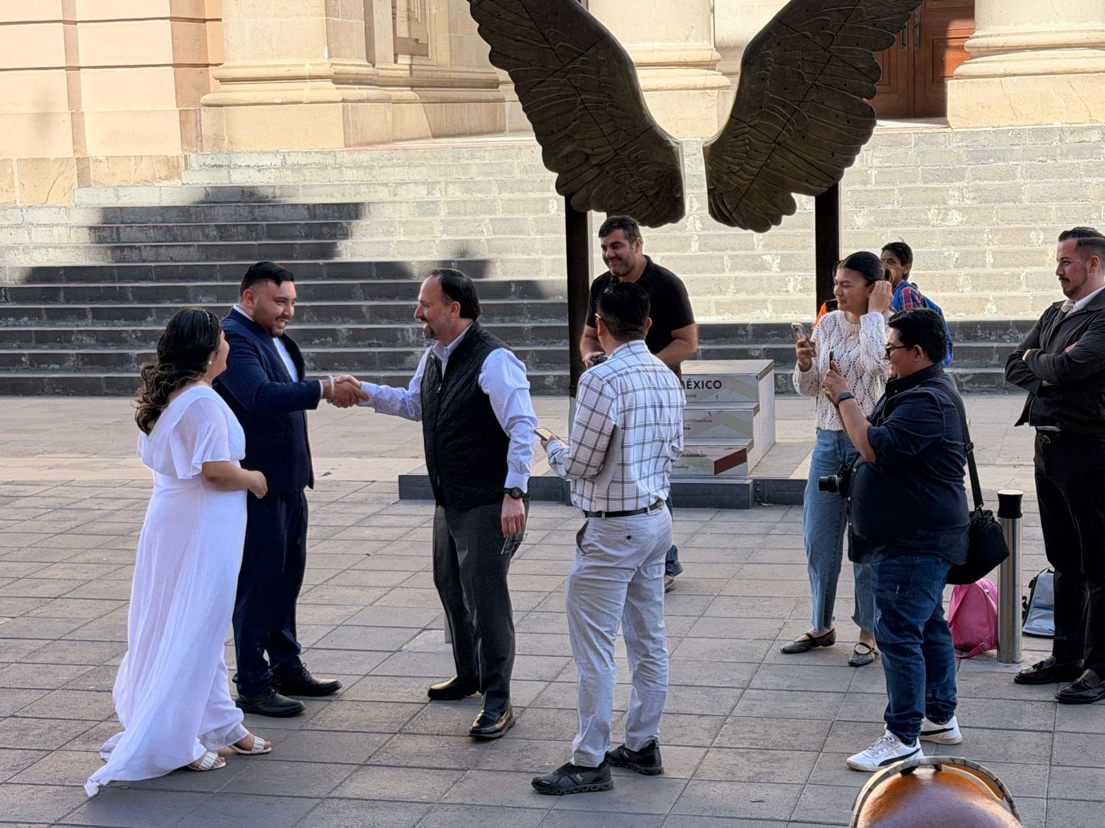 El secretario general de Gobierno, Santiago de la Peña, protagonizó una escena poco común al encontrarse con una pareja de novios que se tomaba fotografías frente a Palacio de Gobierno.