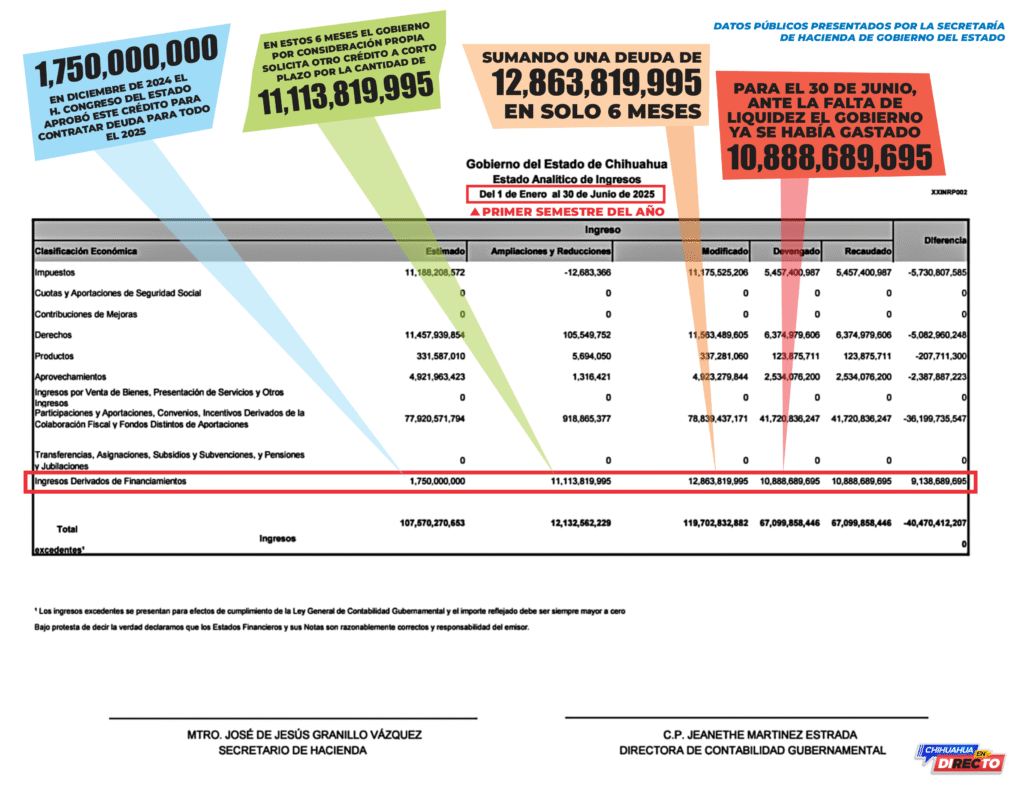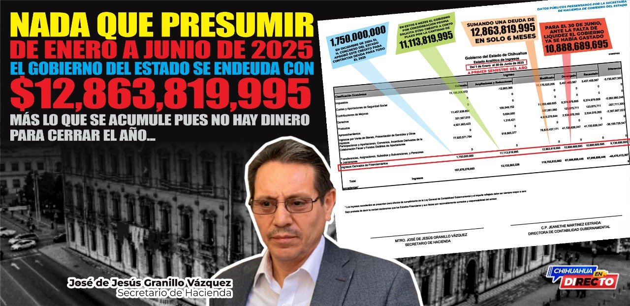 Las cifras oficiales de la Secretaría de Hacienda revelan la magnitud de la presión financiera en Chihuahua: en apenas medio año, el Gobierno del Estado ha contratado deuda por 12,863,819,995 pesos, un monto que refleja la falta de liquidez en las arcas públicas.