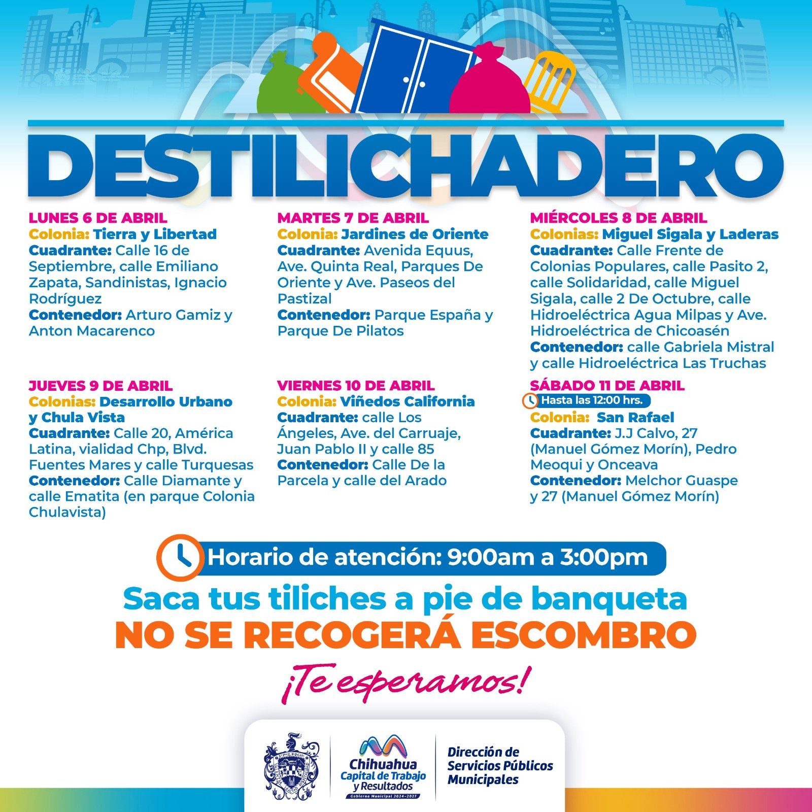 Para evitar acumulaciones de basura de grandes dimensiones en las viviendas, que podría generar plagas o problemas de salud, el Gobierno Municipal, a través de la Dirección de Servicios Públicos Municipales, informa el calendario del programa Destilichadero, que se realizará en ocho colonias de la capital del 6 al 11 de abril.