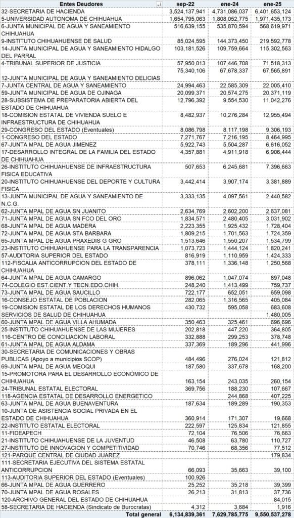 Otra institución universitaria de alto perfil, la Universidad Autónoma de Chihuahua, arrastra una deuda superior a los 1,970 millones de pesos, seguida por la Junta Municipal de Agua y Saneamiento de Chihuahua, con más de 568 millones. Incluso el Tribunal Superior de Justicia, máximo órgano del Poder Judicial estatal, registra un pasivo de más de 71 millones de pesos.