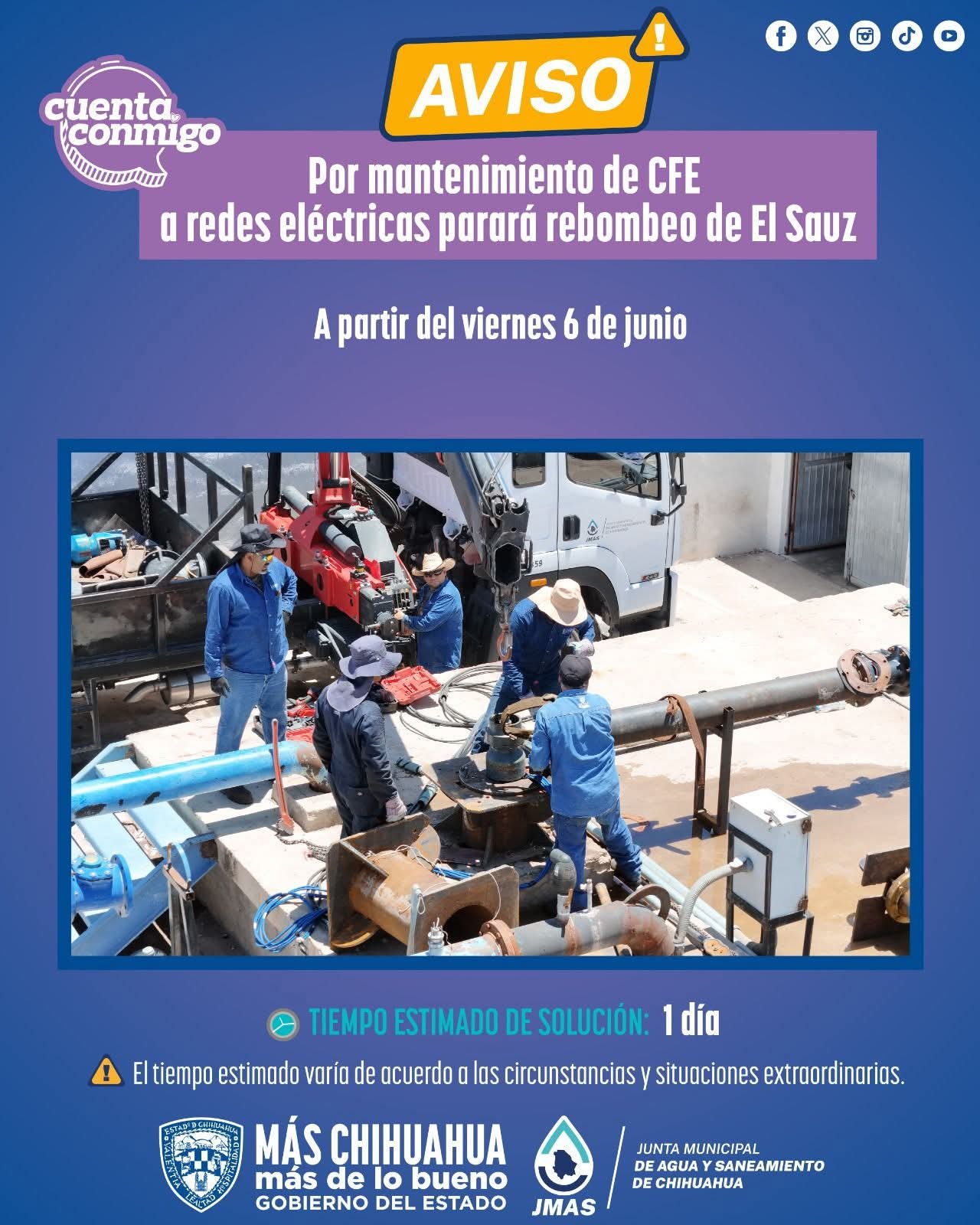 La Junta Municipal de Agua y Saneamiento (JMAS) informó que el rebombeo de El Sauz será suspendido este viernes 7 de junio debido a trabajos de mantenimiento por parte de la Comisión Federal de Electricidad (CFE) en sus redes eléctricas, lo que podría generar baja presión o falta de agua en diversas colonias de la ciudad.