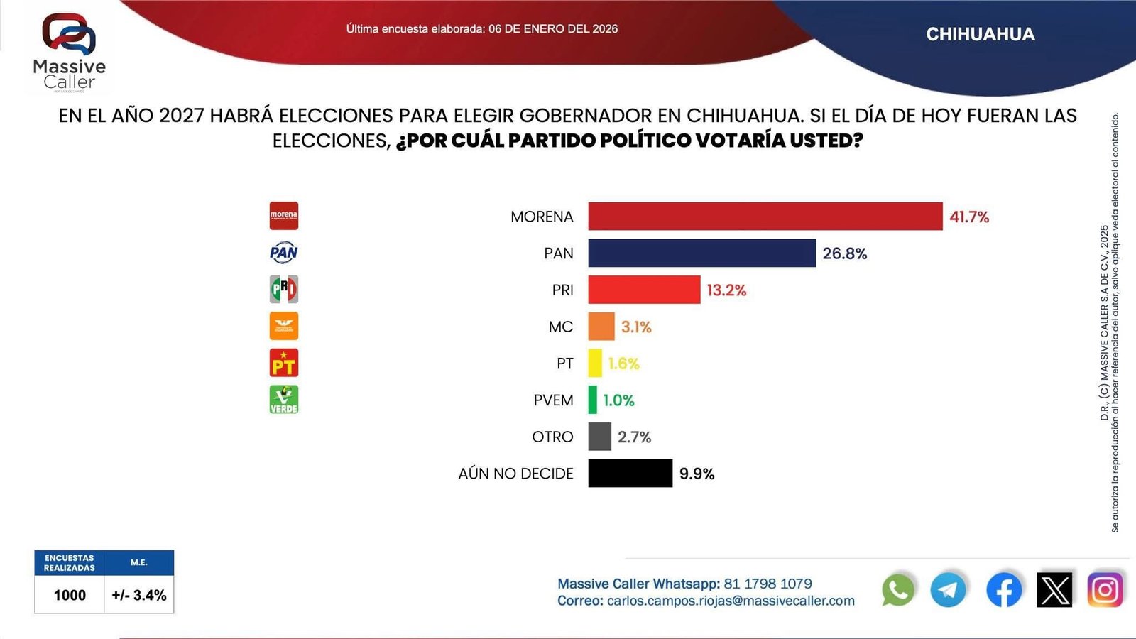 El PRI alcanza 8 % de las preferencias.Con estos resultados, la encuesta de Massive Caller traza un escenario en el que Morena arranca con ventaja rumbo al proceso electoral de 2027, especialmente en municipios estratégicos, mientras que el PAN mantiene presencia relevante en la capital del estado y en Cuauhtémoc, donde la competencia se perfila más cerrada.